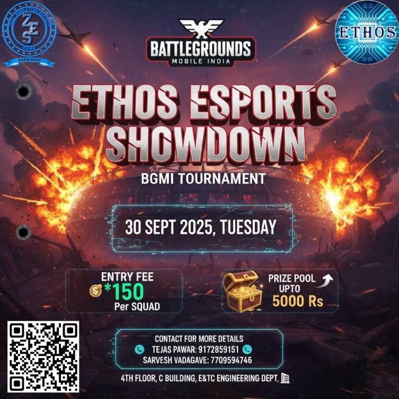 ETHOS, the technical student association of the institute, successfully organized an Esports event titled “ETHOS Esports Showdown – BGMI Tournament” to promote team spirit, strategic thinking, and competitive gaming among students. The event was conducted on 30th September 2025 (Tuesday) at the E&TC Engineering Department, 4th Floor, C Building.