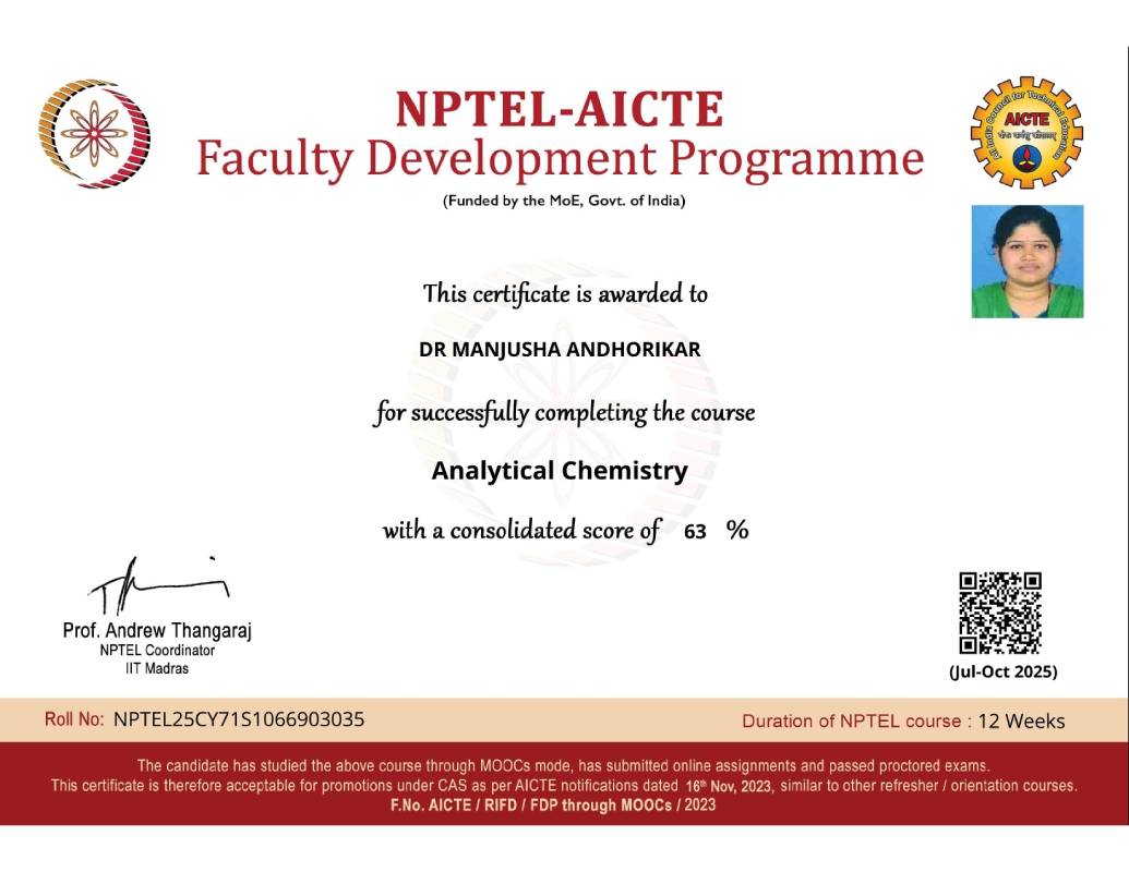 | 1 | Prof. Manjusha Andhorikar | Successfully completed the NPTEL Analytical Chemistry course held in October 2025 with certification |