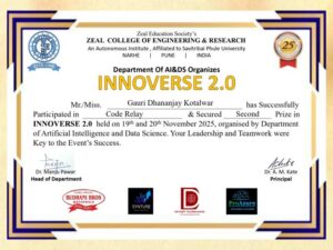 | 2 | CODE RELAY | Team Leader – Srushti Gorade Shruti Sakhare Atharvasingh Ingale Vedika Patil Krushna Agarwal | All — FY-D | Secured First Prize. Honored with a trophy. Certificates issued to all participants. |