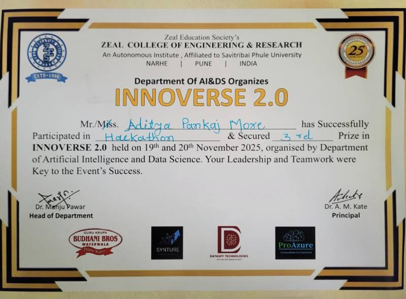 | 4 | INNOVERSE HACKATHON (Team: Binary Brigades) | Mohhamed Aayann Juber Chaus Aditya More Harshit Borkar Shivani Chaudhari | All — FY-E | Secured Third Prize. Trophy received. Certificates issued to all participants. |