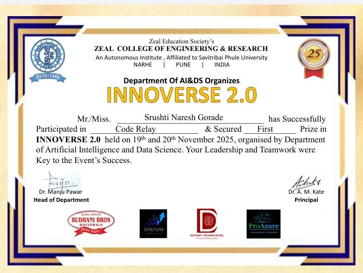 | 2 | CODE RELAY | Team Leader – Srushti Gorade Shruti Sakhare Atharvasingh Ingale Vedika Patil Krushna Agarwal | All — FY-D | Secured First Prize. Honored with a trophy. Certificates issued to all participants. |