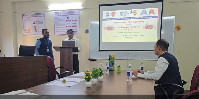 Course: Sustainability and Climate Change Expert: Dr. Bhushan Pachpande, Head-Sustainability, VA TECH WABAG Ltd. Date: 17/01/2026 Time: 9:00 AM to 2:00 PM Venue: CAD Lab, D-Building, Zeal College of Engineering and Research, Pune Faculty Coordinator: Prof. Akash Sopan Ingle
